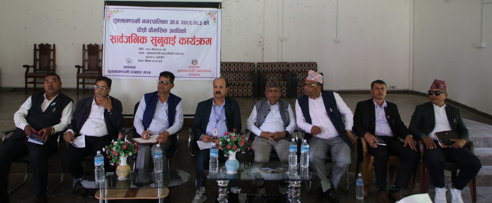 शुक्लागण्डकी नगरपालिकाको आर्थिक बर्ष २०८२÷०८३ को दोस्रो चौमासिक अवधिको सार्वजनिक सुनुवाई कार्यक्रम सम्पन्न भएकोे छ । शुक्लागण्डकी नगरपालिकाको आयोजना र शुक्लागण्डकी पत्रकार मञ्चको समन्वयमा भएको कार्यक्रममा नगरप्रमुख कृष्णराज पण्डित, प्रमुख प्रशासकीय अधिकृत शिशिर पौडेल र शाखा प्रमुखहरुले उठेका प्रश्नको जवाफ दिएका थिए ।