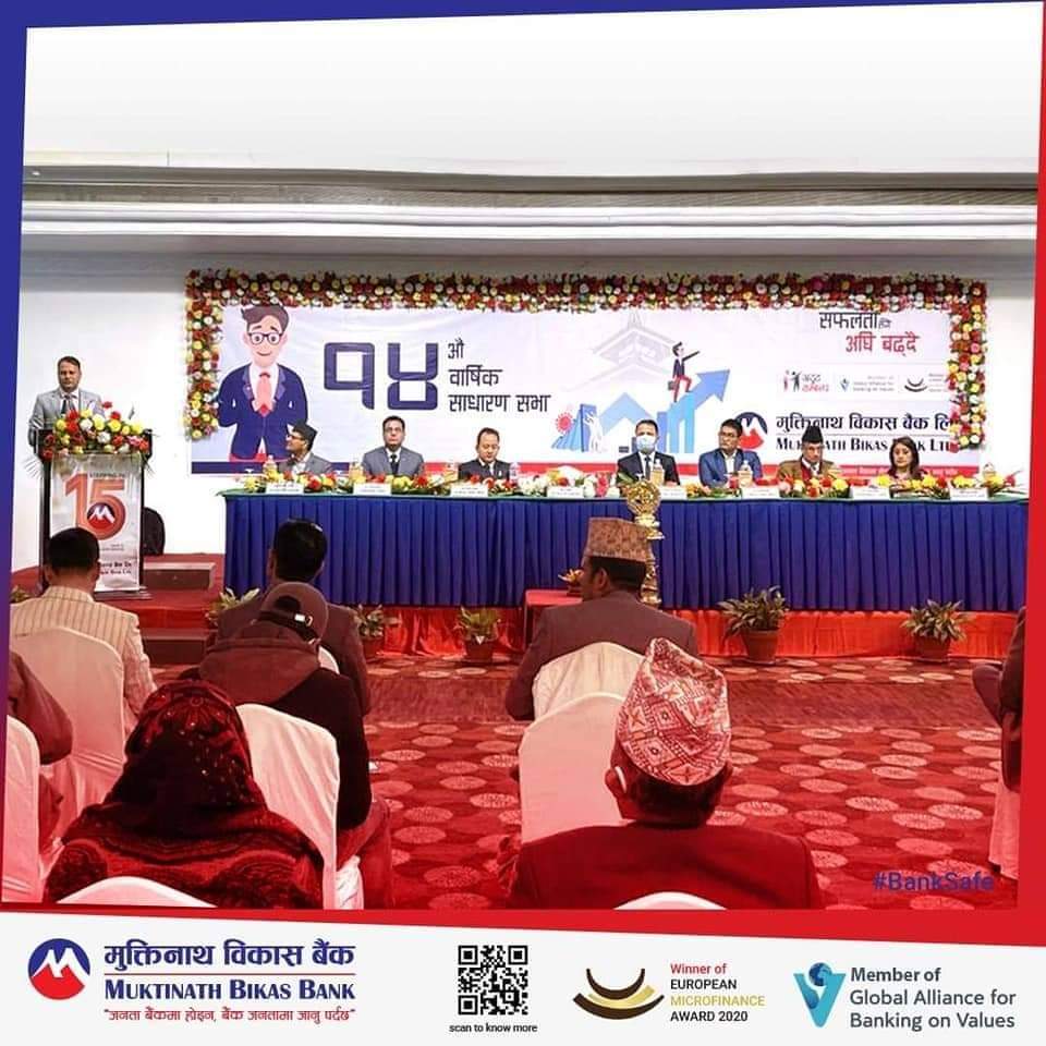 काठमाडौँ, २५ पुस । मुक्तिनाथ विकास बैंकले आज पोखरामा चौधौं वार्षिक साधारण सभा सम्पन्न गरेको छ । उक्त साधारण सभाले आ.व. २०७६÷०७७ को वार्षिक प्रतिवेदन, आ.व. २०७७÷०७८ को लागि लेखापरीक्षकको नियुक्ति लगायतका प्रस्तावहरु सहित आ.व. ०७६÷०७७ को मुनाफाबाट सेयरधनीहरुलाई (४.२५७४ प्रतिशत नगद लाभांस र ११.२५ बोनस सेयर सहित) १५.५०७४ प्रतिशत लाभांस वितरण गर्ने सामान्य तथा विषेश प्रस्तावहरु सर्वसम्मत पारित गरेको छ ।