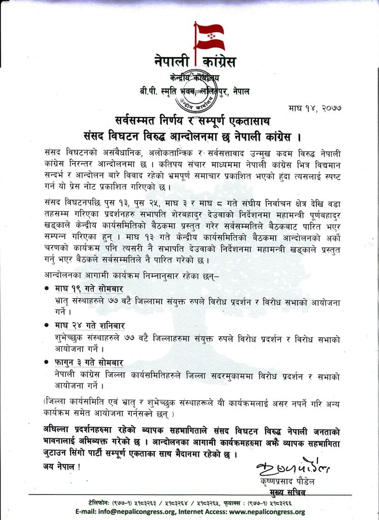 संसद विघटनपछि पुस १३, पुस २५, माघ ३ र माघ ८ गते संघीय निर्वाचन क्षेत्र देखि वडा तहसम्म गरिएका प्रदर्शनहरु सभापति शेरबहादुर देउवाको निर्देशनमा महामन्त्री पूर्णबहादुर खड्काले केन्द्रीय कार्यसमितिको बैठकमा प्रस्तुत गरेर सर्वसम्मतिले बैठकबाट पारित भएर सम्पन्न गरिएको सो पार्टीले आज जनाएको छ । माघ १३ गते केन्द्रीय कार्यसमितिको बैठकमा आन्दोलनको अर्को चरणको कार्यक्रम पनि त्यसरी नै सभापति देउवाको निर्देशनमा महामन्त्री खड्काले प्रस्तुत गर्नु भएर बैठकले सर्वसम्मतिले नै पारित गरेको पार्टी कार्यालयका मुख्य सचिव कृष्णप्रसाद पौडेलद्धारा जारी विज्ञप्तिमा जनाइएको छ ।