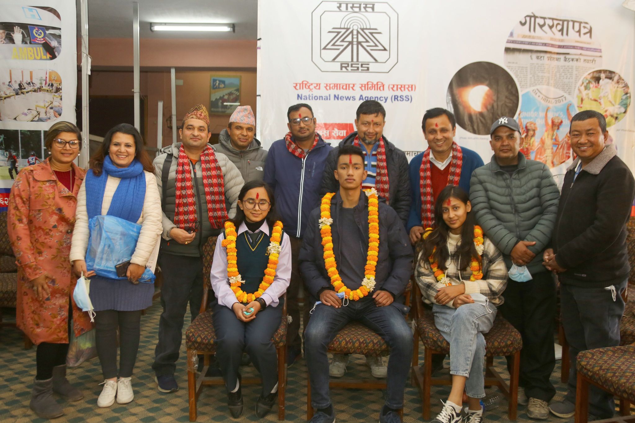 काठमाडाँै, २० माघ । नेपाल पत्रकार महासङ्घ राष्ट्रिय समाचार समिति (रासस) प्रतिष्ठान शाखाको वार्षिक साधारणसभाको अवसरमा संस्थामा कार्यरत पत्रकार एवं कर्मचारीका यस वर्ष माध्यमिक शिक्षा परीक्षा(एसइई) उत्तीर्ण सन्ततिलाई आज सम्मान गरिएको छ । सम्मानित हुनेमा कार्यकारी सम्पादक मनोज कार्कीका छोरा रणवीर कार्की, कार्यकारी सम्पादक सूुर्यचन्द्र बस्नेतकी छोरी इशुु बस्नेत, उपसमाचारदाता राजकुुमार पराजुुलीकी छोरी निर्जला पराजुली र कम्प्युुटर अपरेटर पूूर्णबहादुर कार्कीकी छोरी ब्रेन्जुु कार्की हुनुुहुुन्छ । शाखाले केही वर्षदेखि प्रत्येक बर्ष असार १५ का दिन सन्तति सम्मानलगायत रचनात्मक कार्यक्रम गर्दै आएकामा यस वर्ष कोरोनाका कारण सम्मान कार्यक्रम आज आयोजना गरिएको हो ।