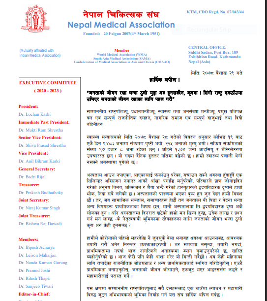 काठमाडौँ,२९ वैशाख । नेपाल चिकित्सक संघले जनताको जीवन रक्षा भन्दा ठूलो मुद्धा अरु हुन सक्दैन भन्दै सिंगो देश एक ठाउँमा उभिएर जनताको जीवन रक्षाको लागि पहल गर्न आव्हान गरेको छ ।