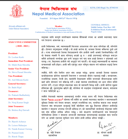 संघले आज एक अपिल जारी गर्दै आजको दिनमा एकमात्र प्राथमिकतामा कोरोना महामारी नियन्त्रण र जनताको जीवन रक्षालाई राखौ भनेको छ । साथै सरकारहरु, राजनीतिक दलहरु, निजी क्षेत्र, सहयोगी निकायहरु सबले जनताको जीवन रक्षाका लागि कहाँ कति योगदान गर्न सक्छौ गरौ भन्ने आव्हानसमेत गरेको छ ।