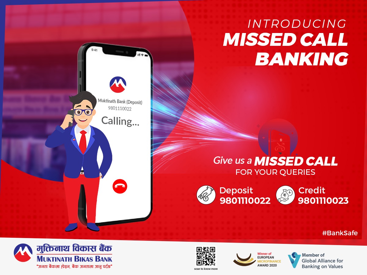 काठमाडौ, ८ जेठ । मुक्तिनाथ विकास बैंकले ग्राहकहरुको सुविधाको लागि मिस्ड कल बैंकिङ्ग सेवा सञ्चालनमा ल्याएको छ । ग्राहकहरुले यस मिस्ड कल बैंकिङ्ग सेवाबाट बैंकको निक्षेप तथा कर्जा सम्बन्धी सेवाहरुको बारे सजिलै जानकारी लिन सक्ने बैठकले जनाएको छ् । यो सुविधा लिन ग्राहकहरुले निम्न मोबाइल नम्बरहरुमा बैंकको कार्यालय समय भित्र मिस्ड कल गर्नुपर्ने छ र केहि समयमै बैंकबाट ग्राहकहरुको जिज्ञासाको लागि सोही नम्बरमा सम्पर्क गरिने बैकको भनाइ छ । निक्षेप संग सम्बन्धित सेवाको जानकारीका लागि ९८०१११००२२ र कर्जा संग सम्बन्धित सेवाको जानकारीका लागि ९८०१११००२३ \